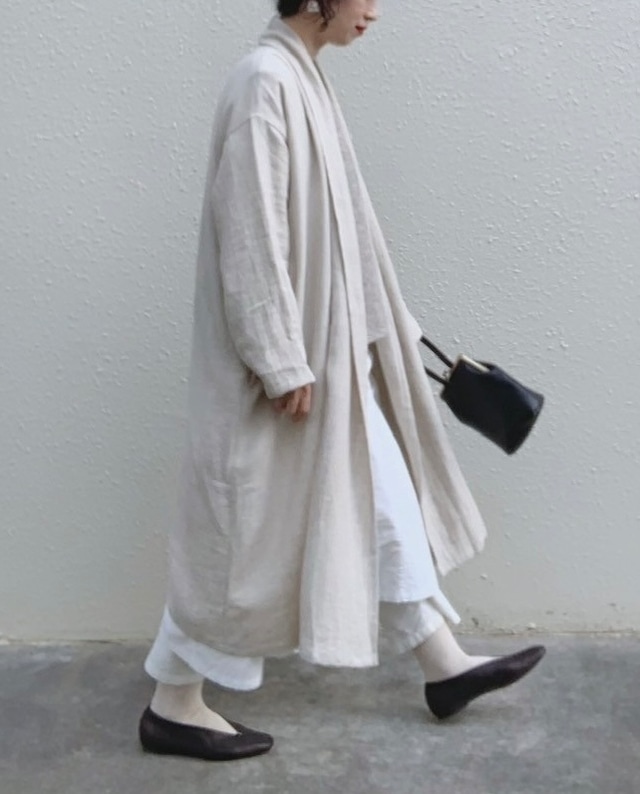 ※こちらの商品は受注制作です 発送予定日は、shopトップページの1つめの商品画像をご確認ください 遠州地方で丹念に織り上げた綾織りのリネンを ゆったりとしたショールをまとったようなコートに仕立てました 肩からフロントにかけて、真っ直ぐに続いていく縁が、まるでストールのようなデザインのローブコート 歩くたびにふわふわと揺らぎを見せつつも 広がりすぎないシルエットです 身幅にゆとりもあるので体型を気にせず着ていただけます 生地は日本の高い技術により丹念に織り上げられた、希少なラミーリネン25番手 肉厚でとろみのよい風合いと、伝統的な染色加工を施した、温もりのあるヴィンテージのような雰囲気のある生地です ワンピース、パンツ、どんなコーディネートにもマッチし、裏地の無い一枚仕立てなのでカーディガンのような気軽さで羽織っていただけます 胸囲 139㎝ / 着丈105㎝ / 袖丈47.5㎝ ramie & linen 100% ご自宅でお洗濯できます ※短い丈がご希望の方…無料でお作り致します。備考にご希望の丈を記入してください ※長い丈がご希望の方…プラス5㎝ごとに500円いただきます。オプションで選択後、備考にご希望の丈を記入してください 備考欄にご記載がない場合、申し訳ありませんが既定丈にて制作させていただきます