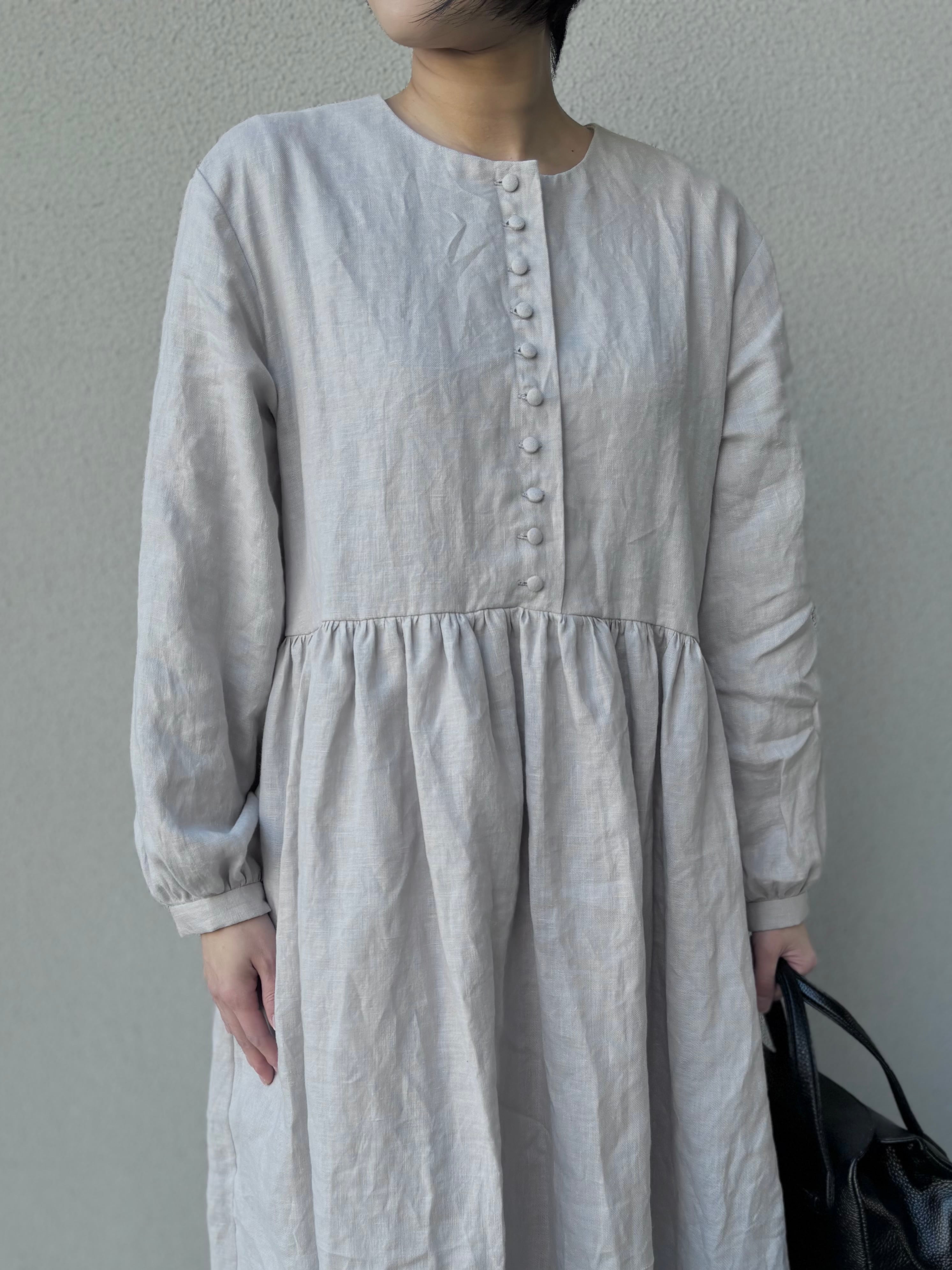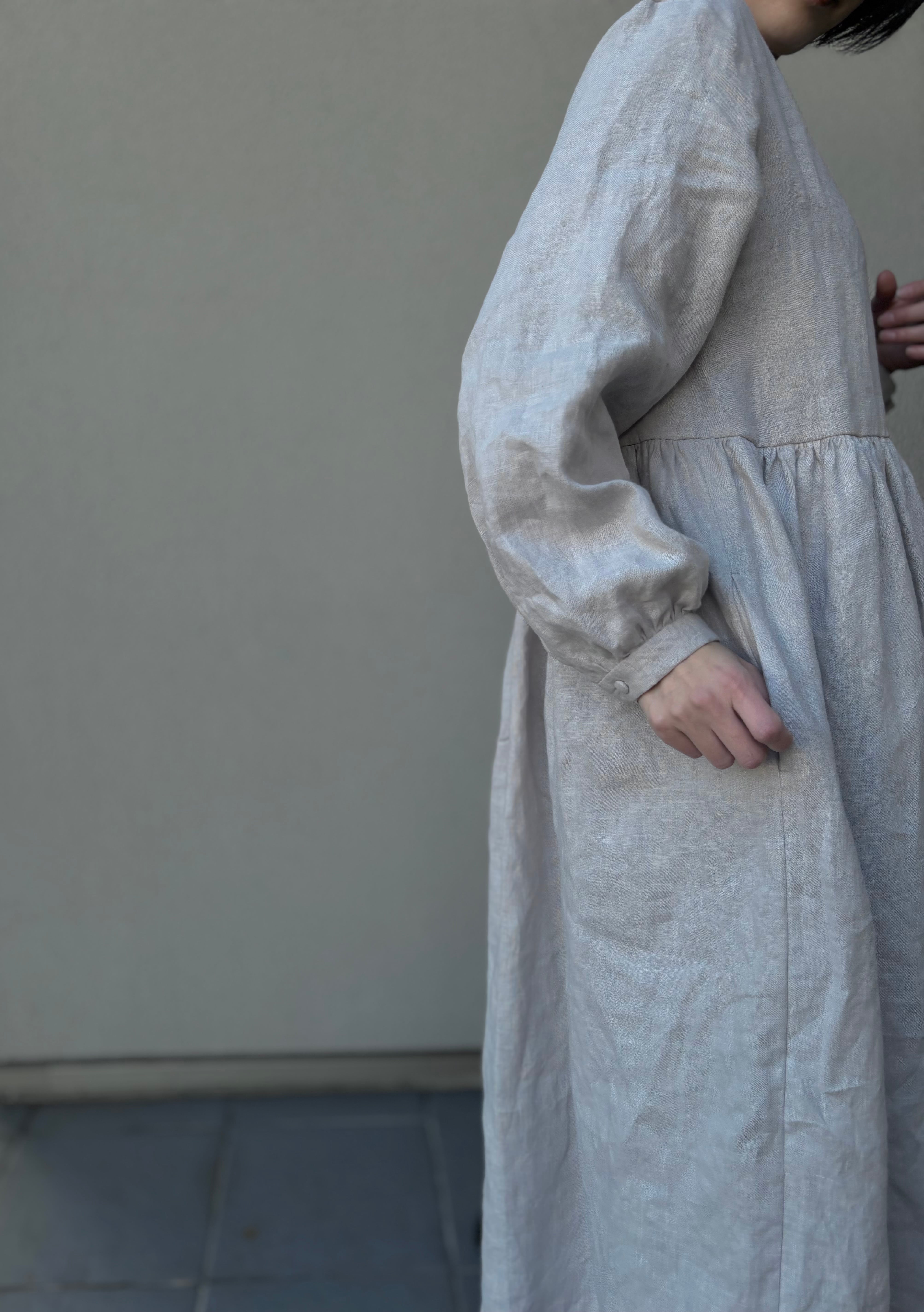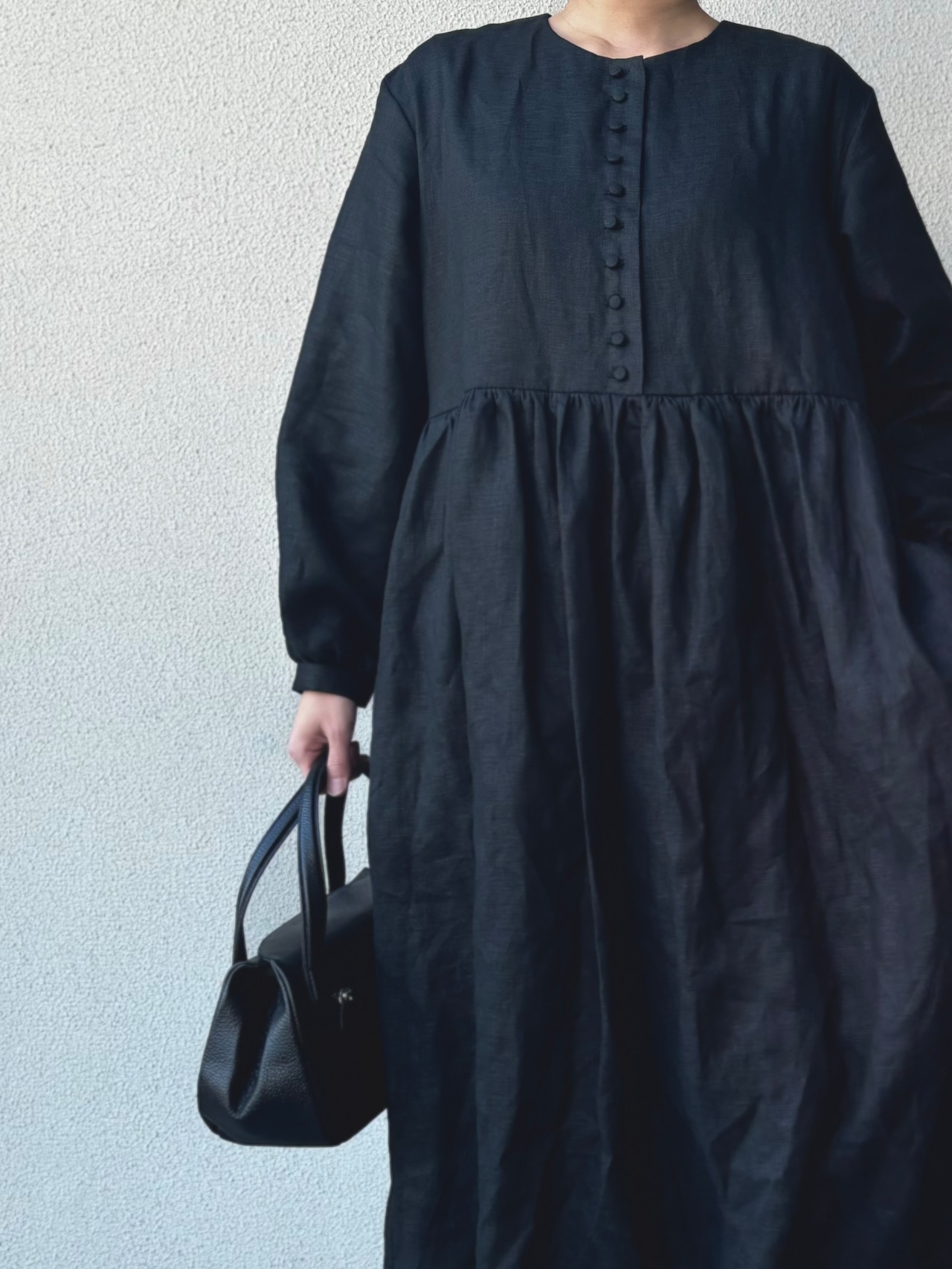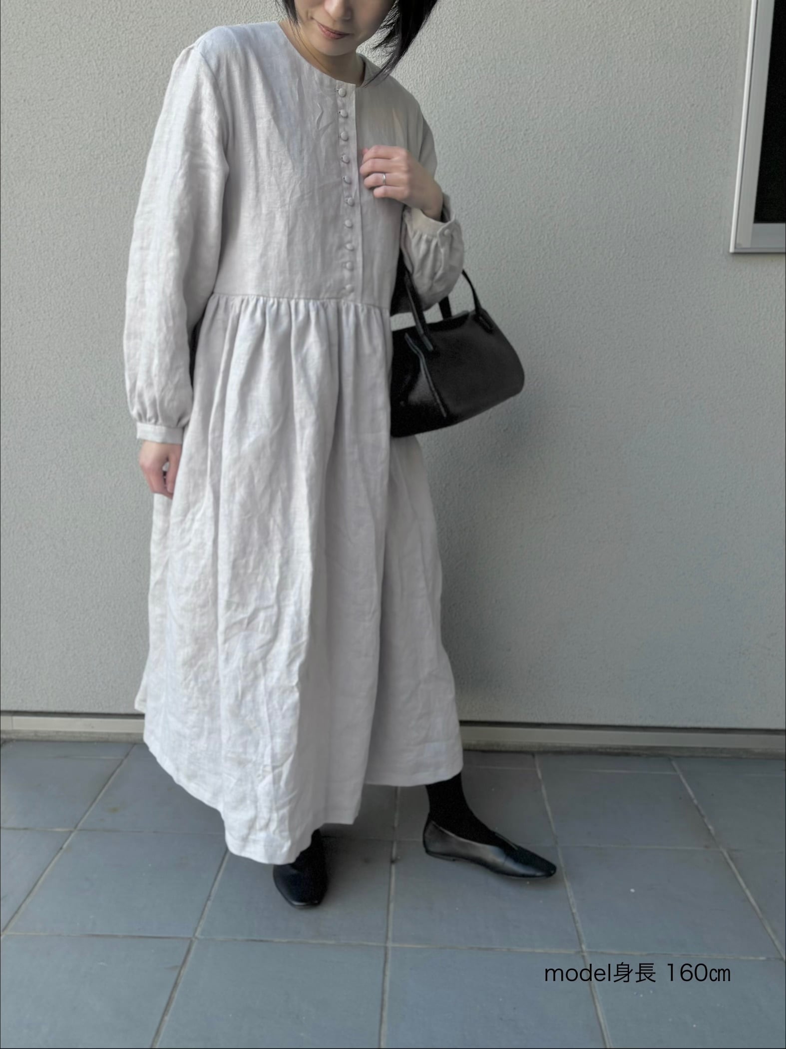ちいさなくるみボタンが並び、ほどよいボリュームのパフスリーブとウエストギャザーがシンプルだけどクラシカルな印象