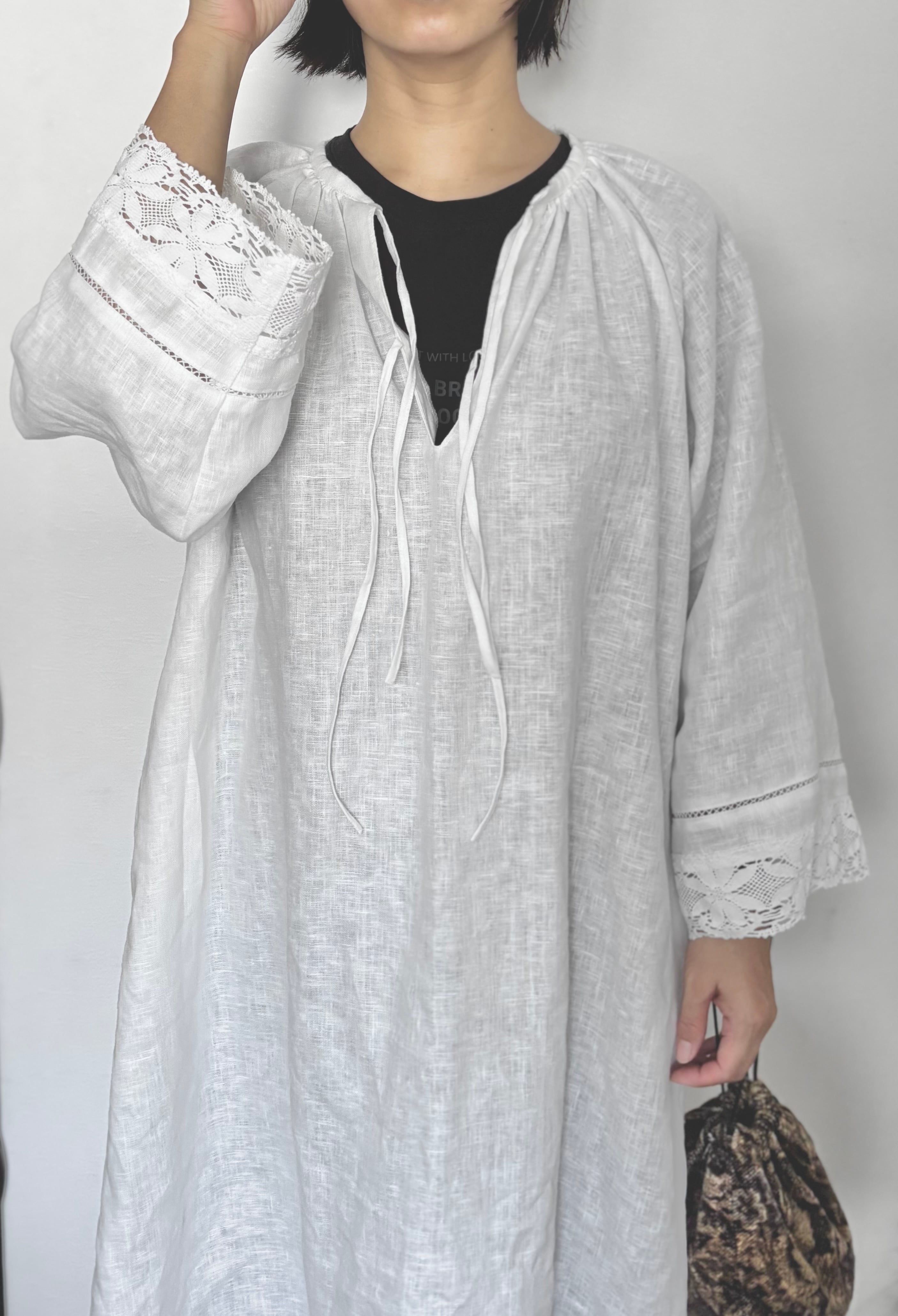 フレンチリネン チャーチスモック風 ワンピース レース 洗い加工 ビンテージライク 選べる丈